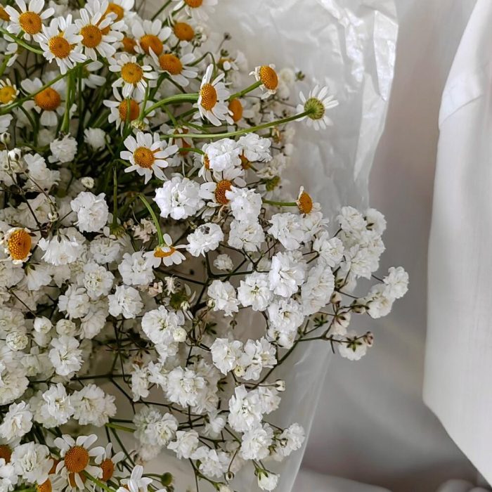Лента атласная – 3 шт.Ромашка кустовая – 7 шт.Упаковка дизайнерская – 3 шт.гипсофила белая – 5 шт.