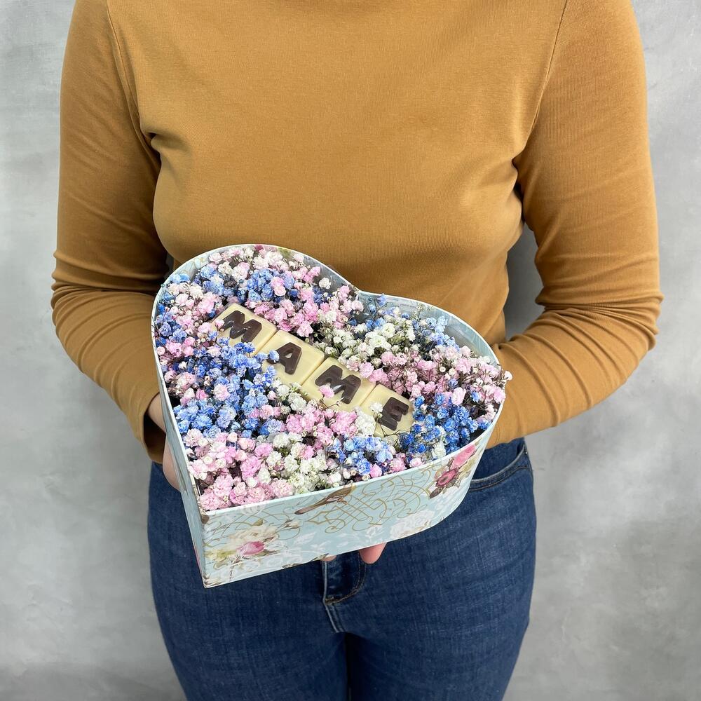 Коробка сердце – 1 шт.Оазис – 1 шт.Шоколадная буква – 4 шт.гипсофила цветная – 5 шт.