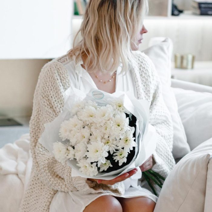 Хризантема кустовая – 5 шт.Лента атласная – 1 шт.Тишью белое – 2 шт.Упаковка корейская пленка – 1 шт.инструкция по уходу за цветами – 1 шт.крафтовый пакет – 1 шт.