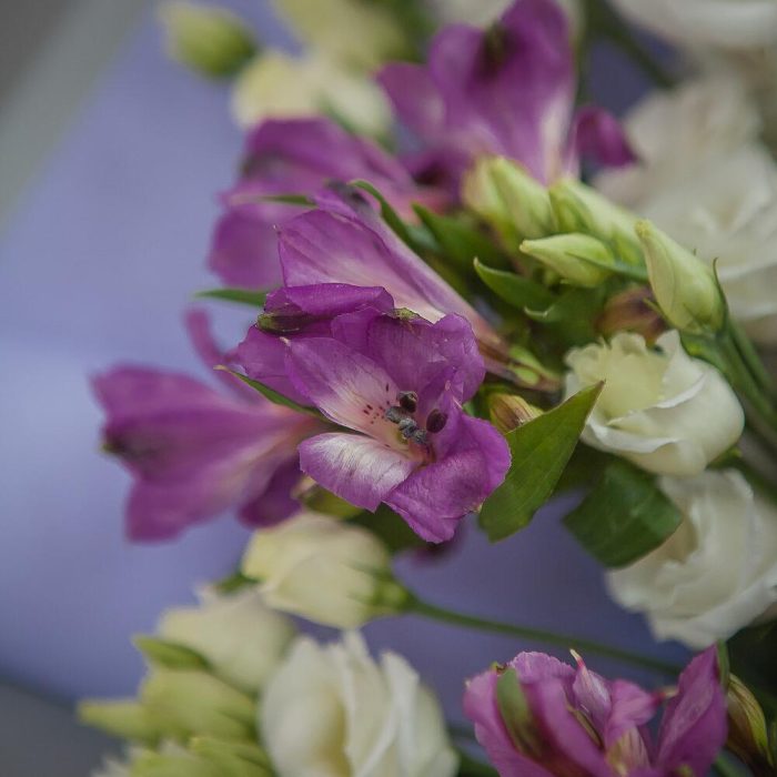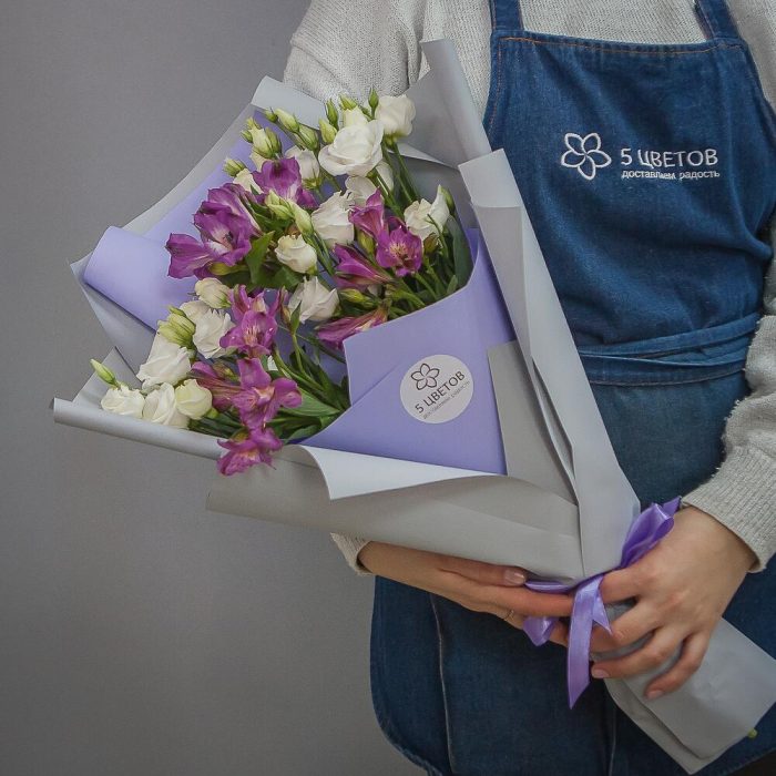 Альстромерия – 3 шт.Упаковка – 1 шт.Атласная лента – 1 шт.эустома белая – 5 шт.