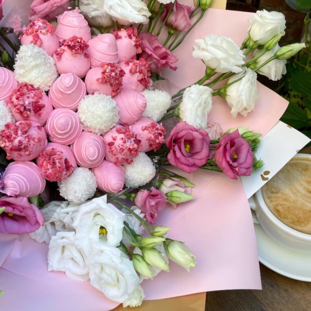 Клубника в шоколаде – 800 гр.эустома розовая и белая – 9 шт.