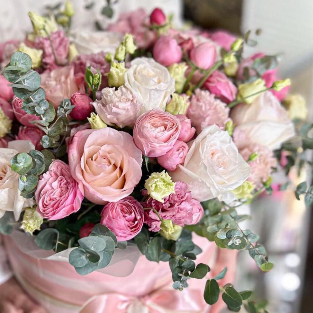 Большая коробка с нежными цветами: розами, лизиантусом и эвкалиптом