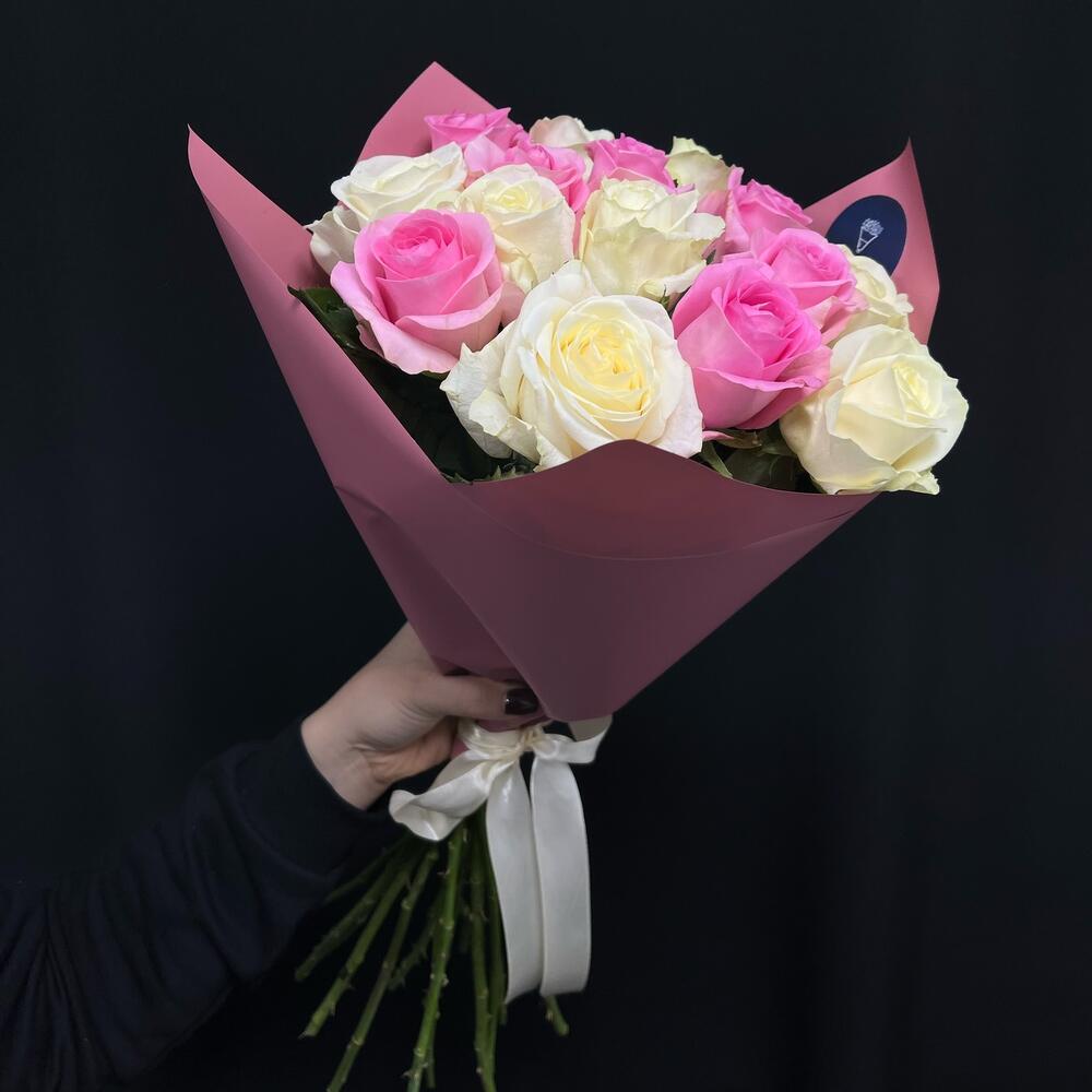 Розовая роза – 7 шт.белая роза – 8 шт.Упаковка цветная – 2 шт.Лента атласная – 4 шт.