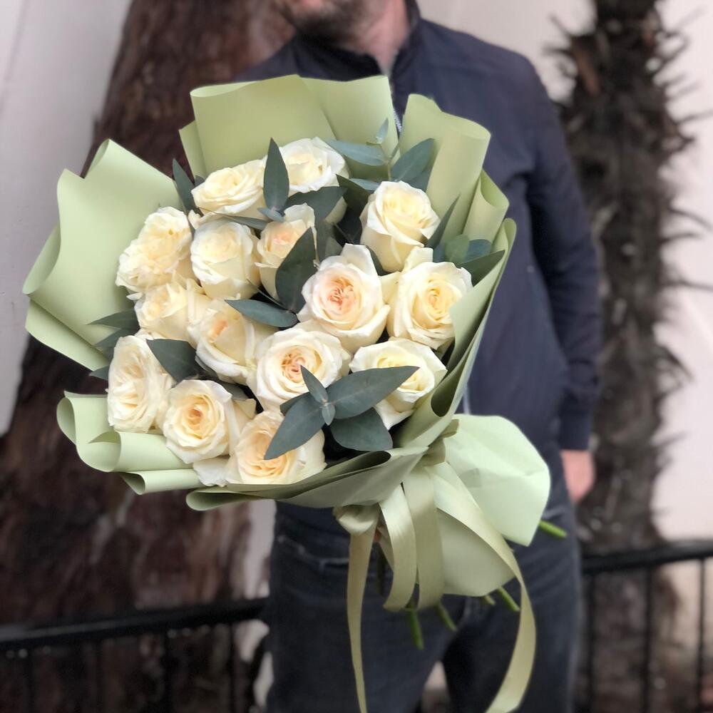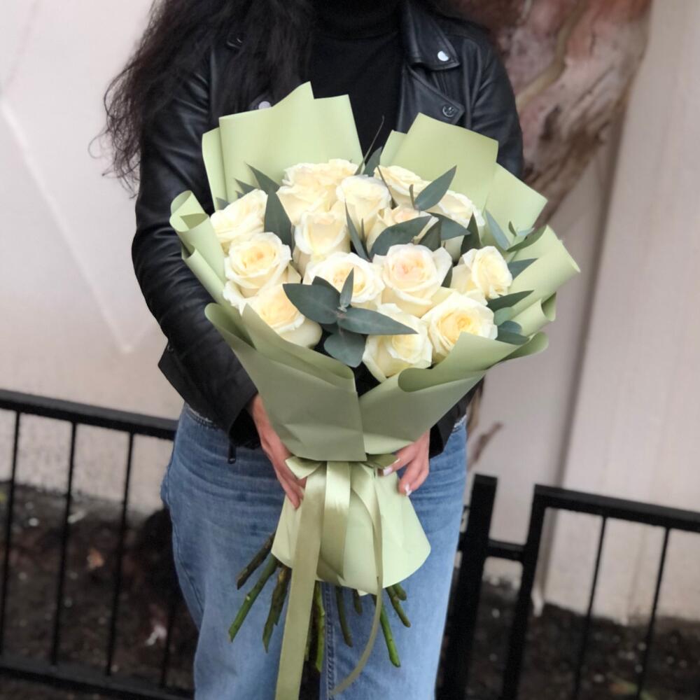 Лента – 2 шт.Эвкалипт – 3 шт.Роза 70 см – 15 шт.корейская бумага – 1 шт.