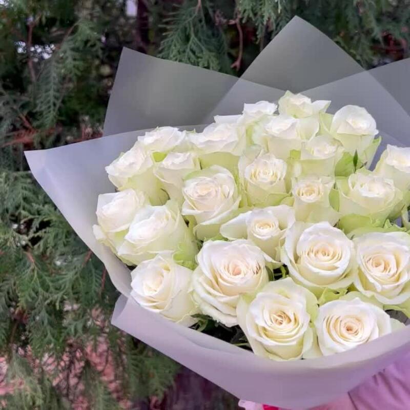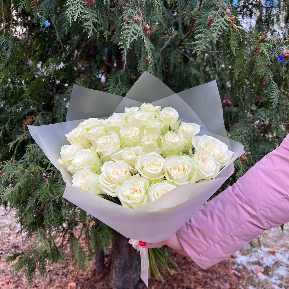 Роза белая – 25 шт.Пленка матовая – 1 шт.Лента атласная – 1 шт.