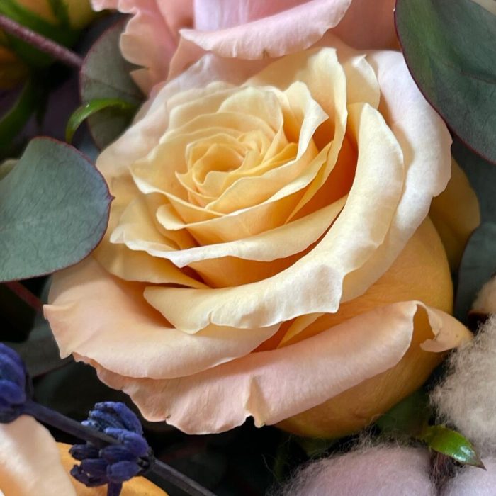 Лаванда (сухоцвет) – 15 шт.Лента – 2 шт.Хлопок – 7 шт.Эвкалипт – 4 шт.Роза одноголовая – 15 шт.Упаковка дизайнерская – 2 шт.Кризал (подкормка) – 1 шт.