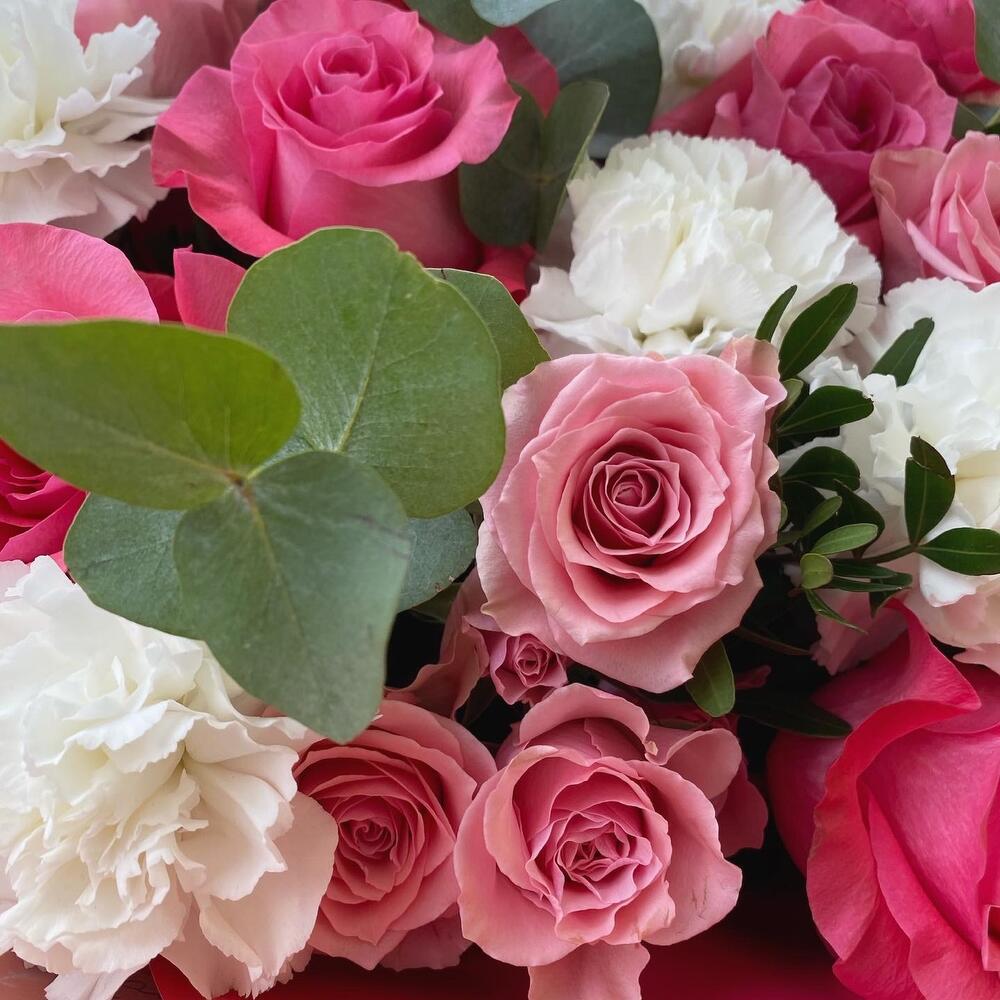 Роза Эквадор – 7 шт.Роза кустовая – 3 шт.Гвоздика – 7 шт.Эвкалипт – 1 шт.Пистация – 2 шт.Пленка корейская – 3 шт.Лента – 1 шт.