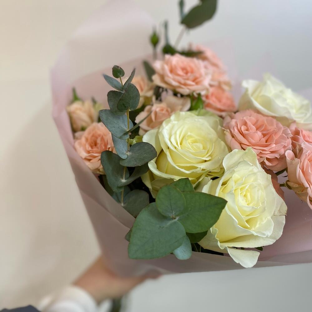 Роза кустовая – 4 шт.Эвкалипт – 3 шт.Роза Эквадор – 3 шт.Лента атласная – 3 шт.Упаковка дизайнерская – 3 шт.