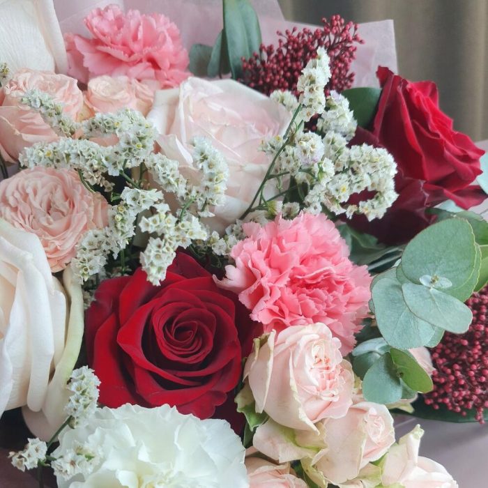 Роза кустовая пионовидная – 2 шт.Роза пионовидная – 3 шт.Роза – 3 шт.Эвкалипт пучок – 1 шт.диантос – 4 шт.Лимониум – 2 шт.Скиммия пучок – 1 шт.Ранункулюс – 1 шт.Упаковка дизайнерская – 2 шт.