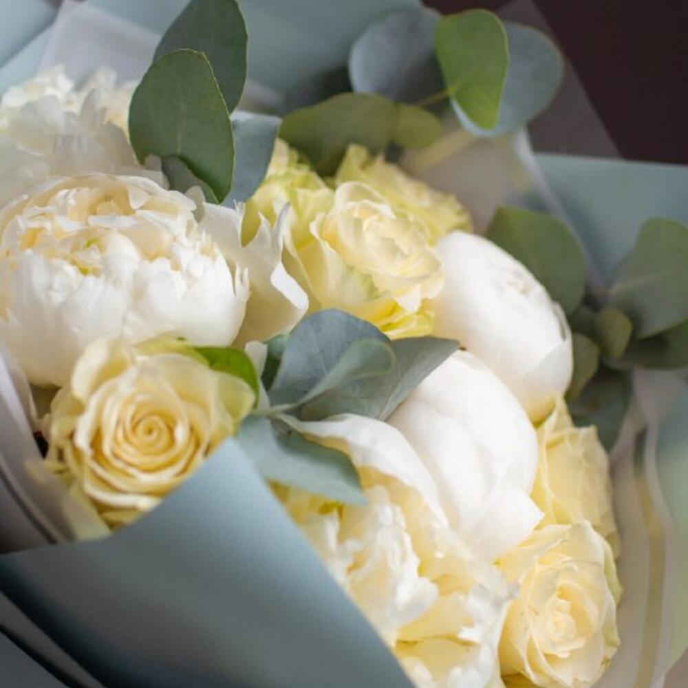 Тишью – 1 шт.Атласная лента – 2 шт.Корейская пленка – 2 шт.эвкалипт cinerea – 4 шт.пион duchess de nemours – 5 шт.кенийская белая роза 50 см – 6 шт.