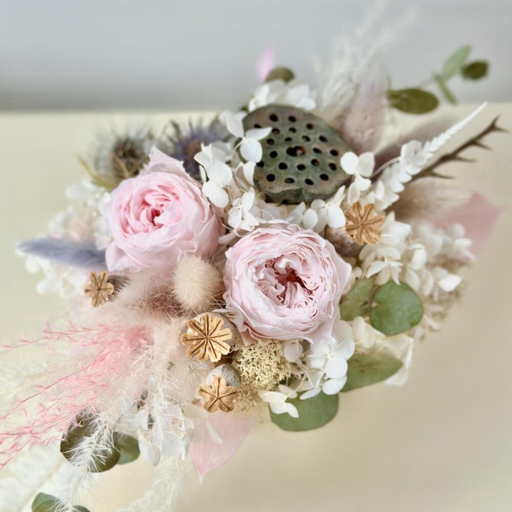 роза стабелизированная – 2 шт.Лотос – 1 шт.Мак – 3 шт.гортензия стабелизированная – 1 шт.Лагурус – 3 шт.Злак – 5 шт.сухоцветы микс – 5 шт.Кашпо керамика – 1 шт.Оазис для сухоцветов – 1 шт.Мох – 1 шт.зелень микс – 3 шт.
