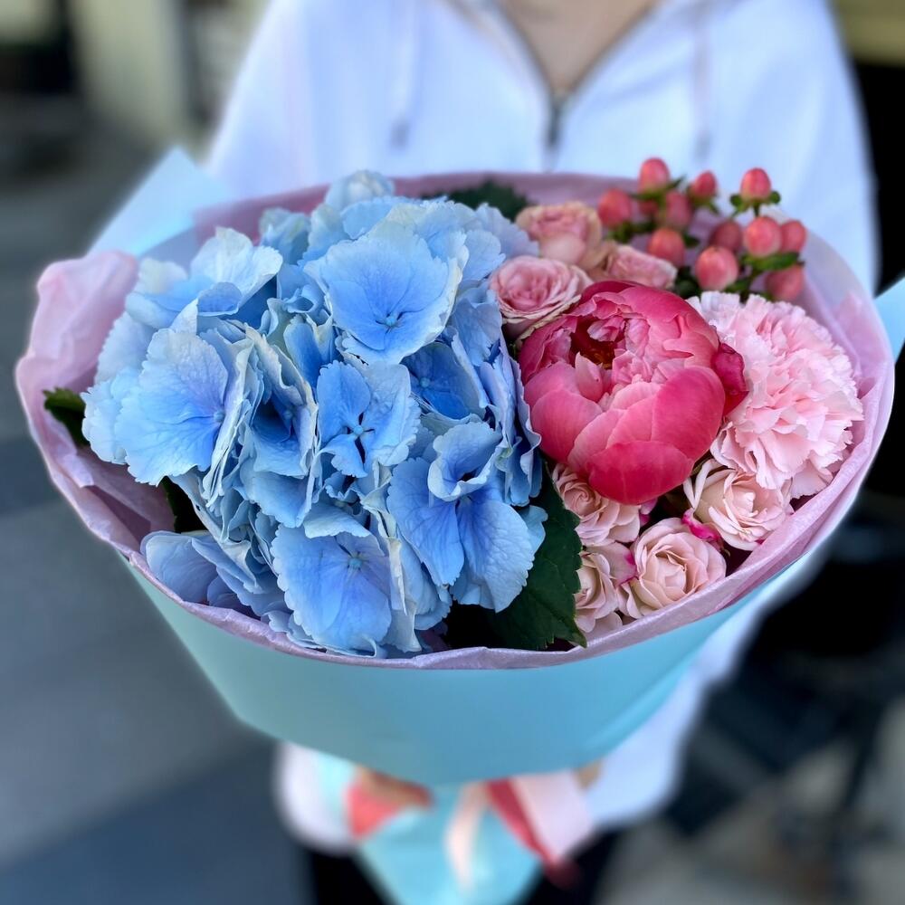 Гортензия – 1 шт.Озотамнус – 1 шт.Роза кустовая – 1 шт.Гвоздика – 3 шт.Пион коралл шарм – 1 шт.подкормка для срезанных цветов – 1 шт.инструкция по уходу за цветами – 1 шт.октрыточка с вашими пожеланиями – 1 шт.шоколадка – комплимент для получательницы – 1 шт.