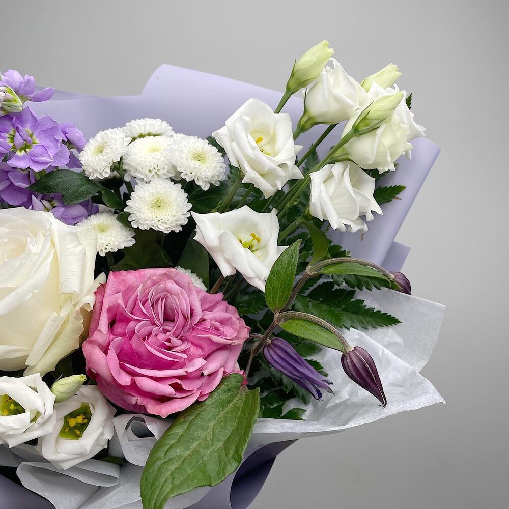 Роза пионовидная – 1 шт.Роза белая – 1 шт.хризантема коконат – 1 шт.Маттиола – 1 шт.Тюльпан – 1 шт.Лизиантус – 1 шт.Папоротник – 2 шт.Клематис – 1 шт.Упаковка дизайнерская – 1 шт.