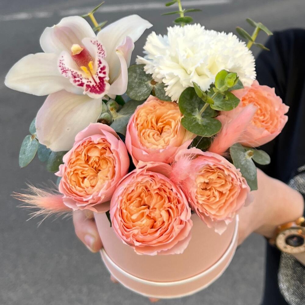 Эвкалипт – 1 шт.Диантус белый – 1 шт.Оазис флористический – 1 шт.удлинитель для орхидеи – 1 шт.Шляпная коробка мини – 1 шт.Роза кустовая пионовидная джульетта – 1 шт.лагурус нежно-розовый – 3 шт.орхидея цимбидиум премиум белая – 1 шт.